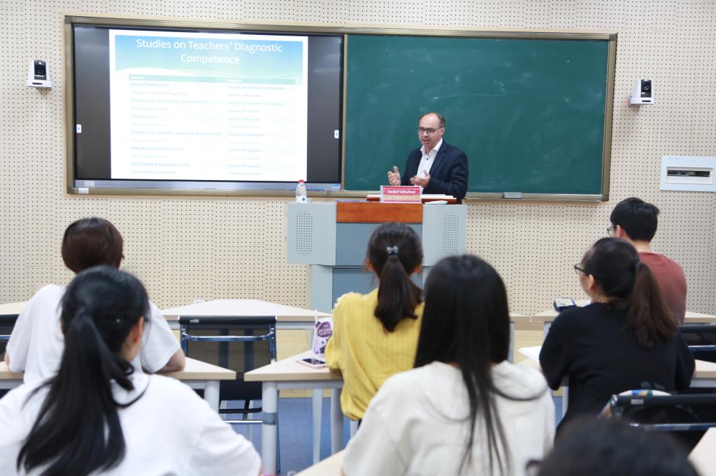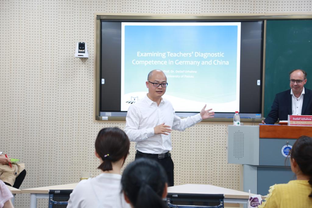 Urhahne教授从中德教师对学生的诊断实验引入主题,讲到了良好教学的四大支柱,课堂教学应该注意内容知识、方法论知识、教室管、诊断能力等四个方面,其中最重要的是教师的诊断能力。具体讲述了什么是诊断能力,教师的诊断能力的重要性,衡量教师诊断能力的方法,以及如何提高教师诊断能力。Urhahne教授将理论和实验数据结合,形象具体地为我们展现教师诊断能力对教育的作用。他认为,学校应该多进行更多基于事实的反馈过程,避免因教师对学生的判断失误导致教学上的失误,提高教师判断准确性,有利于学生的发展,有利于教育的成功性。