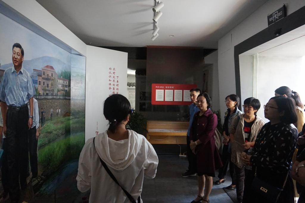党员教师们在村民带领下,沿着村中小道,游览思源亭、连心桥、惠民路,走入村民家中,体会村民生活的幸福指数。并参观了下姜村新农村建设展示馆、村文化礼堂,仔细聆听了介绍,认真观看相关文件、实物和照片,切身感受到了下姜村十多年来翻天覆地的发展变化。村民介绍,下姜村如今的发展离不开党的关怀,时任省委书记习近平亲自指导村干部开展工作,探索美丽乡村建设的新路子,先后四次赶到当时交通很不方便的下姜村调研指导工作,并在离村以后多次亲自写信表示关心。