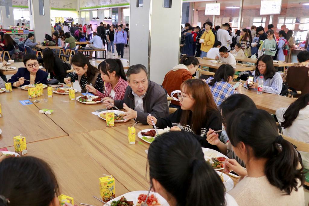赵书记早早来到食堂为学生打好饭菜,新生一下课来就吃到热乎的饭菜。在食堂,赵书记与新生们面对面,一同进餐。“食堂的饭菜还合口味吗?”“学校环境如何,觉得还有哪些设施需要完善?”“大学四年如何规划啊?”赵书记亲切地关心着新生们生活、学习方方面面。当赵书记问及:“你们和你们的以前同学知不知道浙外呢?”一位同学表示,她初中的时候就来浙外参加过艺术水平考试,那时就知道了浙外,觉得浙外是一个很温暖的大学,现在来到了浙外,更加感受到了这种温暖。另一位同学则表示,她身边同学消息都比较闭塞,在她参加完三位一体后,她的同学才知道,她的同学对于没有提前了解浙外并参加浙外的三位一体表示遗憾。赵书记也表示,希望同学们可以利用寒暑假时间回到原高中老师时成为浙外的小小宣传员。