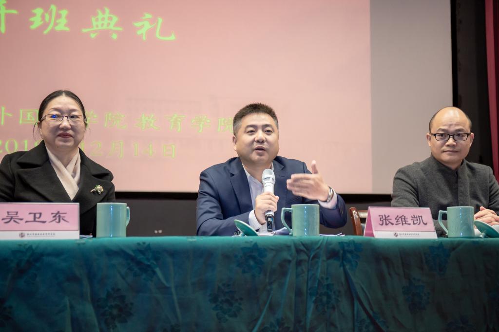 简短而隆重的开班典礼结束后,高强度的培训学习立即启动。吴卫东院长首先为“两高班”上“开学第一课”,作了题为《从学科人到教育人:未来教师的核心素养》的开篇报告,通过阐释未来教师的核心特质应具备的成长性思维、弹性决策、终身学习、有效沟通、团队合作、国际理解、积极情感、尊重包容、热情创新等要素,引领学员们体悟:那些体验着人生,因而从事教育的人们,乃是唯一真正的教师。
