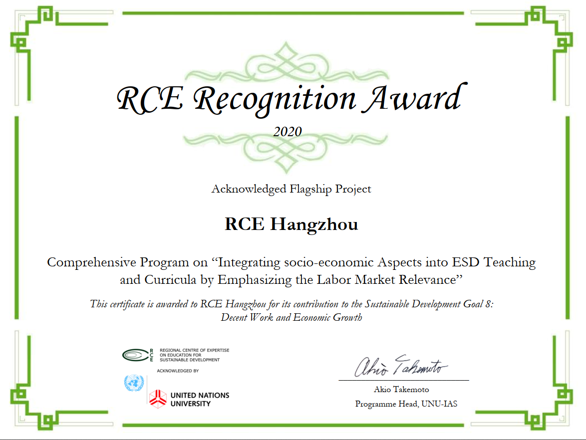 近日,我校牵头成立的联合国可持续发展教育(杭州)专业区域中心(简称RCE杭州)联合德国汉斯·赛德尔基金会向联合国大学提交了“融入社会经济要素的ESD教学和课程设计”项目材料,并荣获“2020年RCE贡献项目”称号。