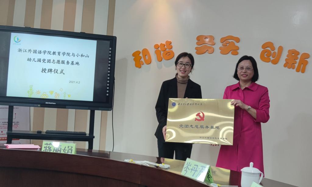 党总支向小和山幼儿园授党团志愿服务基地铜牌。高书记说,非常高兴双方能共建“党团志愿服务基地”,要求我院教师要积极对接幼儿园的各项发展需求,开展专业指导;学生要在全实践课程和志愿服务中营造童心向党、童心向团的良好氛围。高书记介绍了我院正在开展的“明理、增信、崇德、力行”党史学习教育,目前大学生志愿者已经把党史课堂送进了小学,也同样可以让党史学习教育进幼儿园。