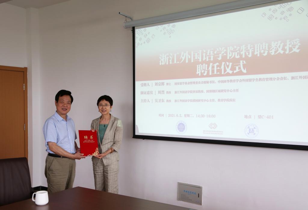 6月2日,国家留学基金管理委员会原秘书长、中国高等教育学会外国留学生管理分会理事长刘京辉女士续聘为我校特聘教授。校资深教授、国别和区域研究中心主任周烈教授为刘京辉女士颁发聘书。校德国研究中心主任、唐人街影院