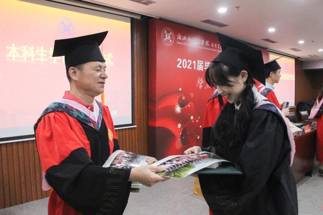 毕业生参加本科生学位授予仪式。院党总支书记高亚兵教授拨穗,院长吴卫东教授颁发学位证书,副院长何伟强、贾随军赠送毕业纪念品,副书记周礼赠送毕业照片,班主任行握手礼。