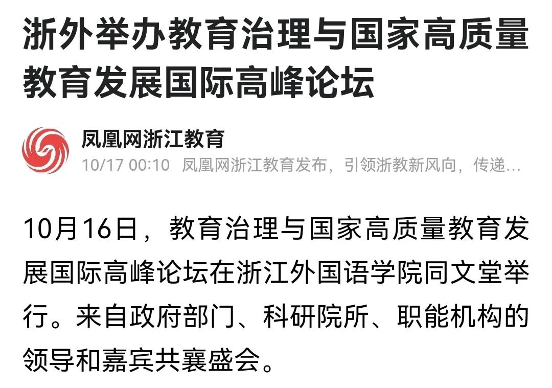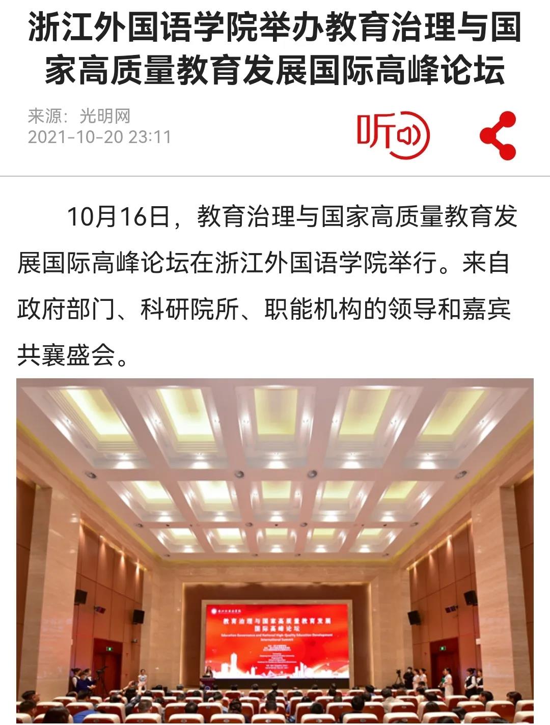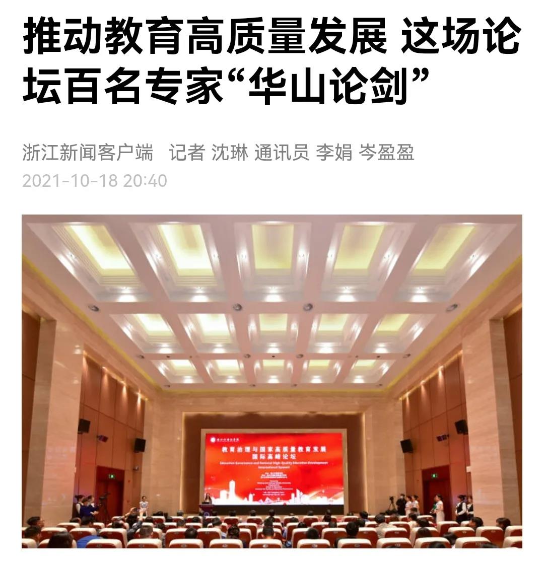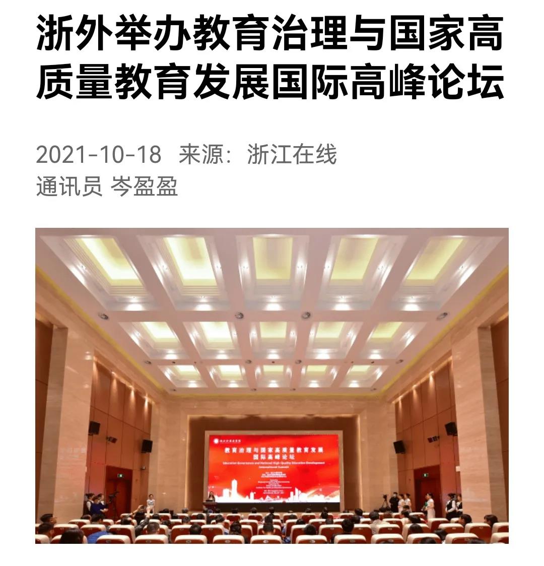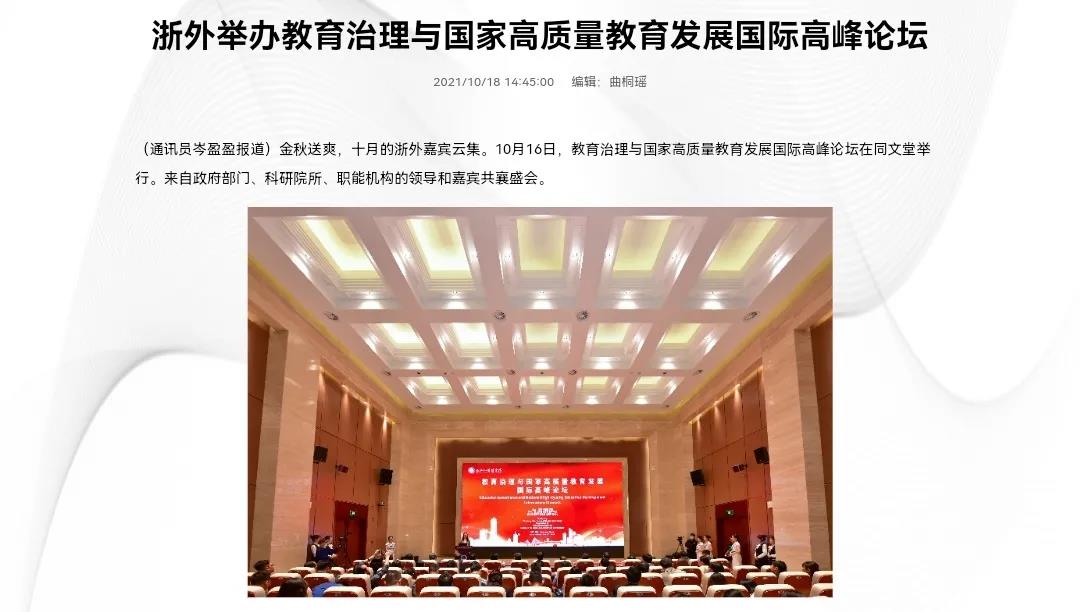 10月16日,浙外举办教育治理与国家高质量教育发展国际高峰论坛。来自北京大学、清华大学、香港大学、美国加州大学等50余所国内外大学和科研机构的110位专家学者围绕会议主题展开深入研讨。光明网、中国新闻网、浙江新闻客户端等多家媒体分别以《唐人街影院 举办教育治理与国家高质量教育发展国际高峰论坛》《推动教育高质量发展这场论坛百名专家“华山论剑”》《教育治理现代化的“浙江样板”长啥样?浙外举办的这场高峰论坛来探讨》等为题进行了关注报道。