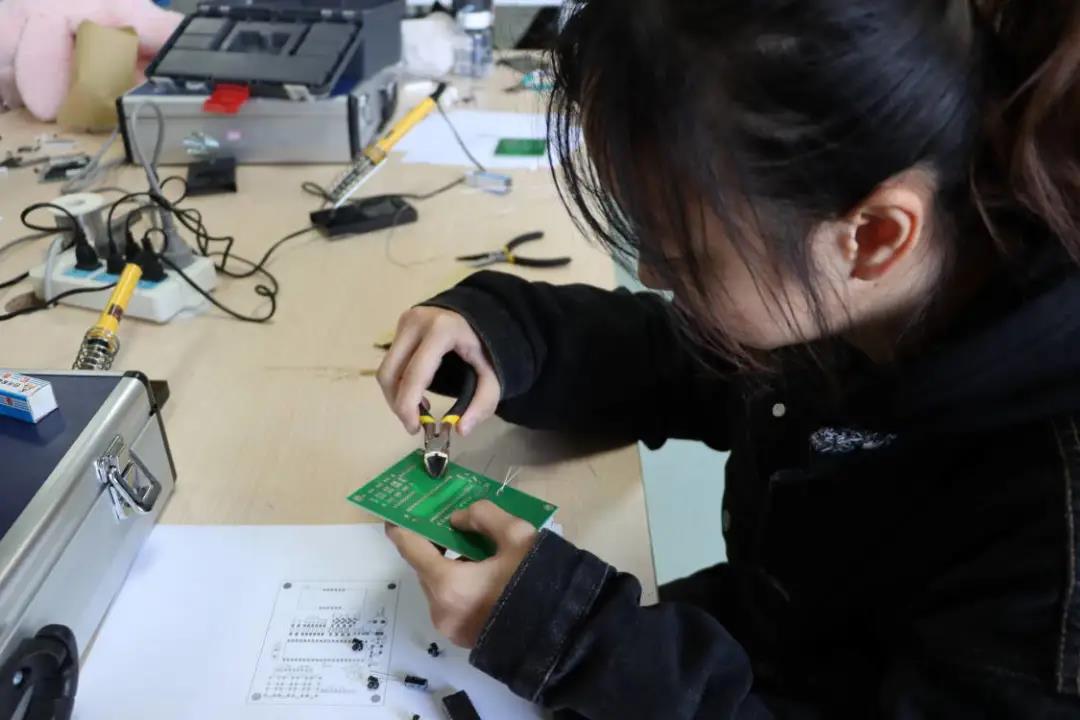 在实践周,我认识到做实验最重要的是细心和耐心,确保每个管脚和其所对应的焊盘对准精确,一旦元件接错,就需要反复检查找到接错的元件将它重新摆正。因此,要想成为焊接贴片元件的高手,需要勤加练习从而提高熟练程度。平日,我努力寻找各种旧电路板旧芯片来练手。在烧录单片机程序时,要注意自己的芯片是否完好引脚有无缺失等情况,缺失的引脚或者损坏的芯片无法将程序录入。