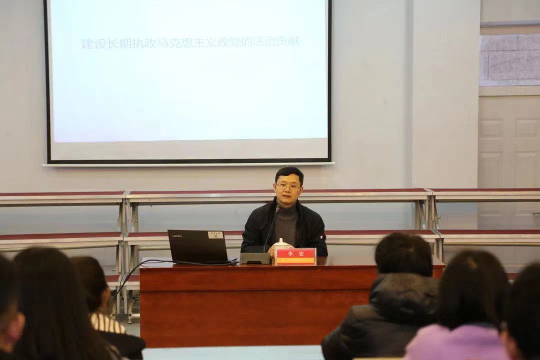 “法者,天下之仪也。”李安从法治架构、法治功能、法治进程、法治范围四个方面分享了十九届六中全会决议中有关法治的问题。他不仅结合中国实际谈到习近平新时代中国特色社会主义思想实现了马克思主义中国化新的飞跃,还详细阐释了习近平新时代中国特色社会主义思想的精神实质和法治内涵。他希望同学们能够学法、知法、守法,自觉增强法治意识,在新时代新征程中展现新担当新作为。