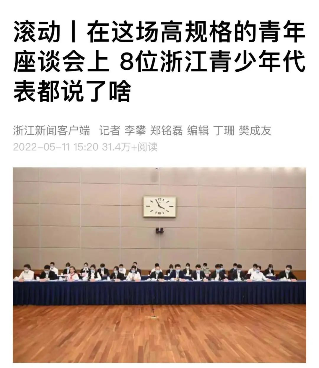 5月11日下午,我省举行浙江青少年学习习近平总书记在庆祝中国共产主义青年团成立100周年大会上重要讲话精神座谈会,8位优秀青年代表和省委书记面对面,分享青春故事,交流青春感悟。