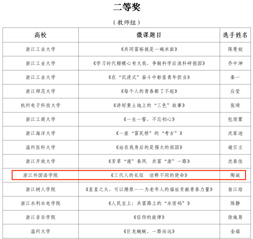 近日,由共青团浙江省委、浙江省教育厅、浙江省学生联合会共同主办的2022年度浙江省高校思政微课大赛落下帷幕。经过高校初赛、省级复赛、最终决赛评选,我院陶诚老师《三代人的长征诠释不同的使命》、19小教2班徐沁同学《脚踩坚实的黄土地》两项作品分别荣获教师组、学生组二等奖。