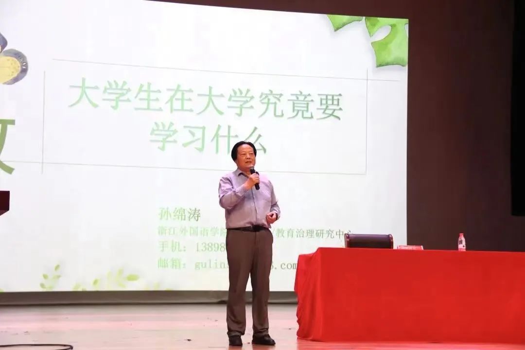 特聘教授、教育治理研究中心主任孙绵涛教授在追梦堂为近四百名2022级新生开展始业教育,作《大学生在大学究竟学习什么》主题讲座。