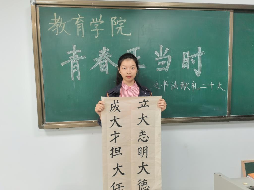 为了帮助同学们更好牢记习近平总书记的谆谆教诲、感受传统智慧与时代之变,本次活动以习近平总书记讲话与所引用的诗词名句为书写内容,以软笔、硬笔两种形式和篆书、隶书、楷书、行书等多样字体书写。一行行或工整或古朴或洒脱的汉字于笔下流出的是教院人“请党放心,强国有我"的誓言。这次书法活动不仅激起了教院学子对中华优秀传统文化的热爱,更鼓舞着教院学子凝心聚力、求索真理、埋头苦干,满怀信心迎接党的二十大胜利召开。