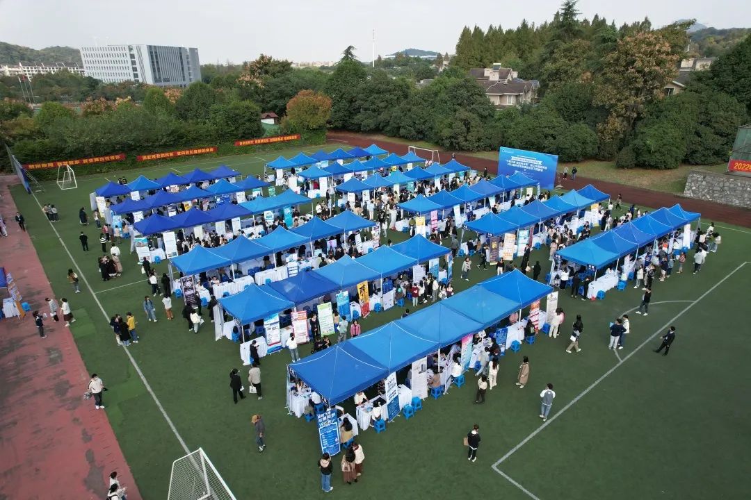 2023届毕业生秋季就业见习招聘会正火热进行中。足球场被划分成多区域,四周红底黄字的条幅为学院2023届毕业生加油打气,激励学子“敢拼敢闯”“把握新就业”,一幅幅印有招聘信息的宣传牌在向学院2023届毕业生招手。