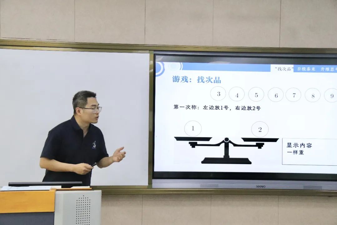 张一帆老师则通过“找次品”的小游戏,不动声色地一步一步引领学生思考、总结出解决问题的策略,思考数学问题的本质,体验数学学科的魅力。