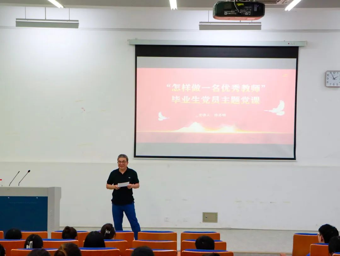 徐教授从“明确使命”与“好老师标准”两个维度,深入浅出地为大家讲述了如何成为一名优秀的教师。徐教授从“为谁教”“教什么”“怎么教”三个问题切入,摆事实、讲道理,娓娓道来如何成为一名新老师,做成一名合格教师,长成一名骨干教师,最终蝶变为一名优秀教师。徐教授表示,大学生走上教师道路到蝶变为一名优秀教师可以有“三个一”最终构建学术圈的过程。所谓“三个一”,即一节属于自己的课,一个自身参与的教学研究课题,一篇独立完成的教学研究作品,并努力拥有优秀的引路人、优秀的学术团队、互学互促的朋友,从而构筑自己的学术圈。此外,他还建议毕业生们,关键阶段积极规划,选择正确方向,保持信念,坚持学习,于迷惘中开创出一片新天地。