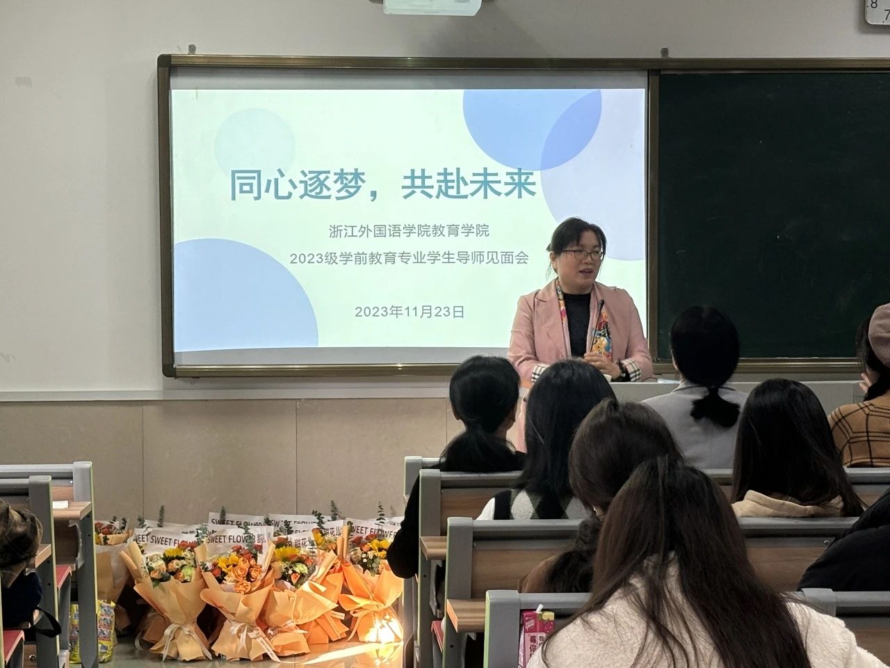 党总支副书记李娟介绍了导师制的意义和主要内容,引导同学们思考“我们来浙外要做什么”,“如何做”等问题,并对老师、同学如何协同联动更好助力全面发展提出希望与要求。系主任冯翠典老师认为导师制给了老师们更多育人工作的空间,也给了师生双方互学互长的机会。