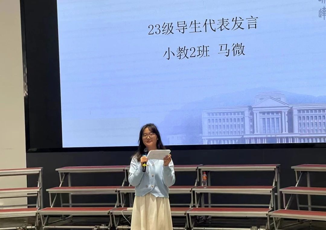 导师代表张帅认为大家需要在理论和实践的结合中感受其魅力,并真诚地建议脚踏实地地做好每一件事。老生代表,20学前1班班长王乐怡表达了对老师的感恩之情,她建议多与自己的导师进行交流。新生代表,23学前3班金冰姿希望大家应利用好学院提供的优秀导师资源,实现自我目标。23级辅导员俞贝老师希望同学们在大学生涯中不断探索,绽放自己的青春之花。