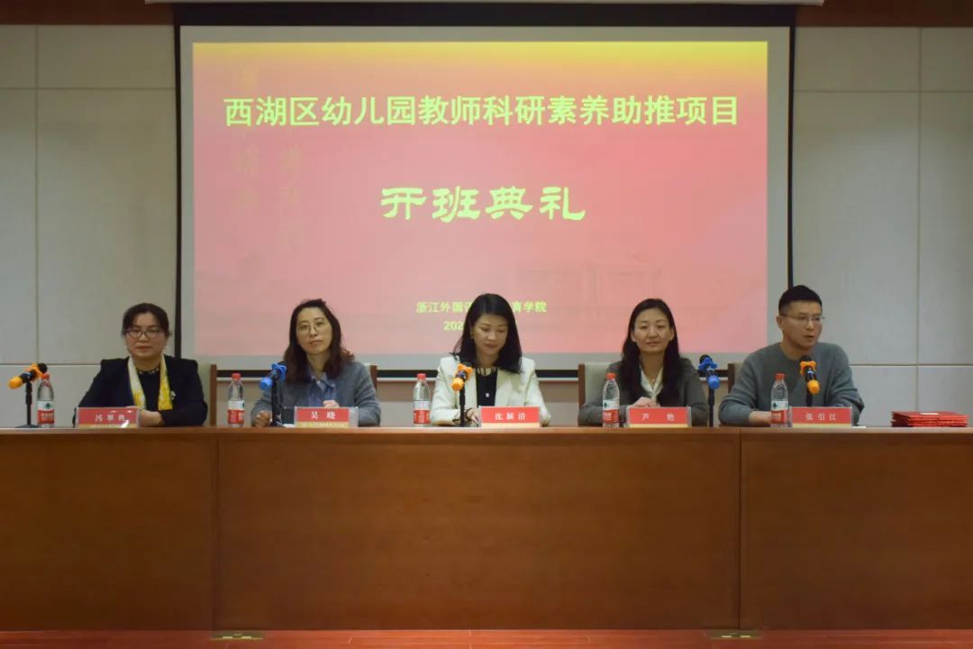 在开班典礼上,吴晓致欢迎辞并为三位学前教育指导中心领导颁发外聘证书,沈颖洁主任代表西湖区学前教育指导中心颁发科研导师证书。学前系主任冯翠典,从项目缘起、总体思路、具体目标等方面进行解读。