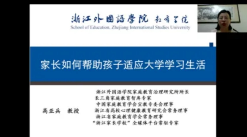 家庭教育专家、心理系教授高亚兵应邀为家长朋友们做了题为《家长如何帮助孩子适应大学学习生活》的分享。高教授指出,家长们在孩子进入大学后,需要积极帮助他们适应新的教育和生活模式,并引导他们提高自主学习的能力。她还分享了一些家长与孩子之间建立有效沟通和交流的方法,包括尊重孩子的意见、鼓励他们表达自己的需求。