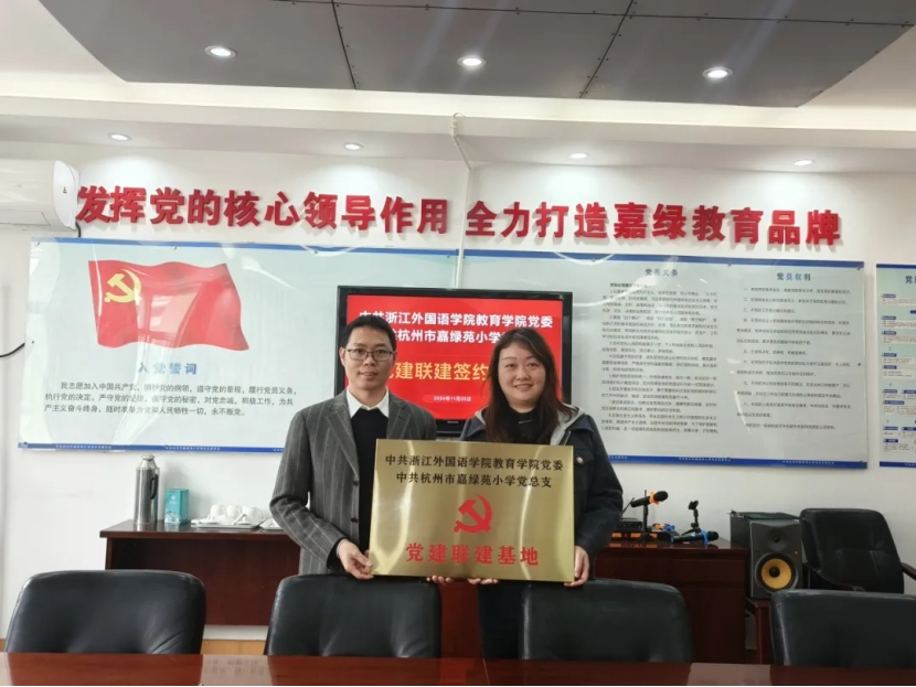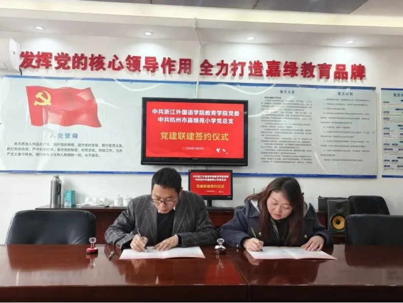 为深入贯彻落实党的二十大精神和二十届三中全会精神、学校第三次党代会精神,积极推进党组织政治建设,深化基层党建联建机制,11月20日上午,我院党委与杭州市嘉绿苑小学党总支签订党建联建协议。学院党委书记阮建苗和杭州市嘉绿苑小学副校长何乔斐出席签约仪式。