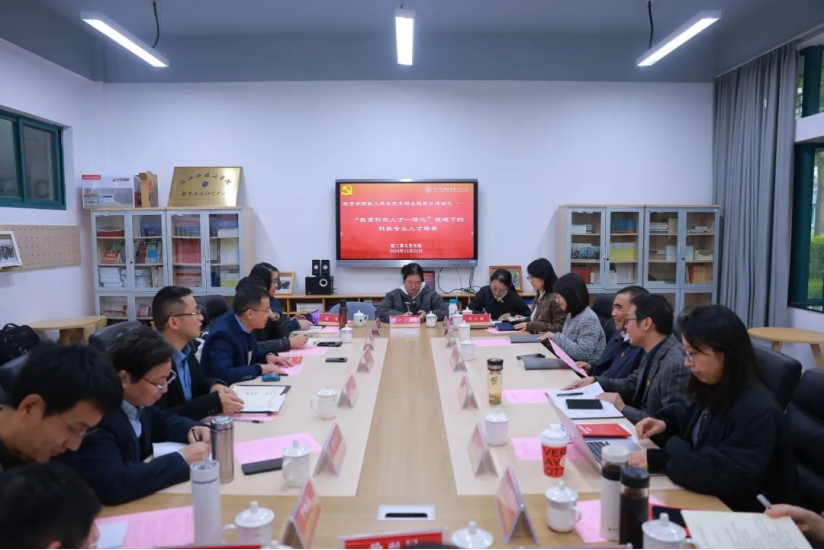 冯启领学了党的二十大、二十届三中全会中关于“教育科技人才”的相关论述,分享了科教党支部近年来的发展历程、取得的成绩等,并结合科教专业人才培养,引发了“教育科技人才培养一体化”视域下科教专业人才培养路径的讨论。