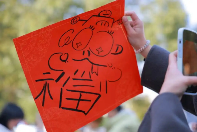 一摞红纸、一方墨砚,同学们在创作现场挥毫书写各式各样的福字。可爱的乙巳蛇、形态各样的福、匠心独具的吉祥如意……书写着对美好未来的期许和美好生活的向往,这不仅代表着一份新年礼物,更承载着一份心意,传递着一份祝福。