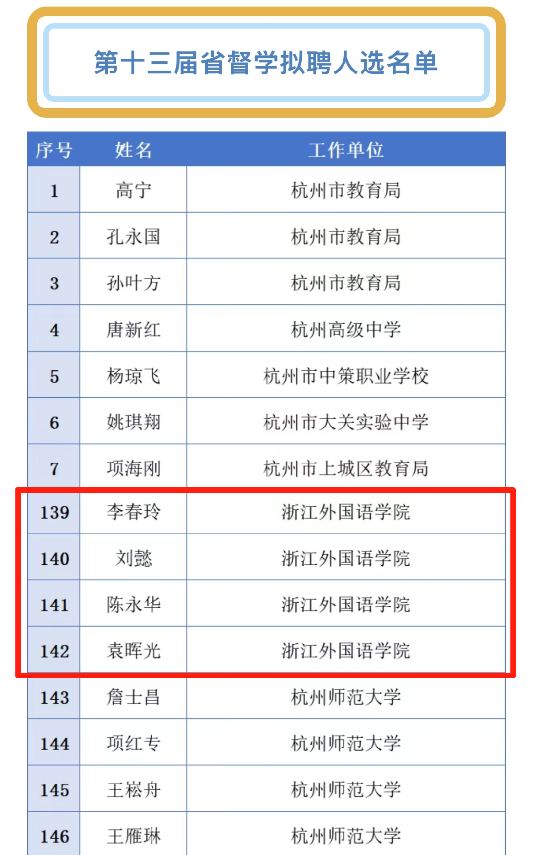 近日,浙江省教育厅公示了第十三届省督学、特约省督学拟聘人选,根据《浙江省教育督导条例》《浙江省省督学聘任办法》和教育督导工作需要,经各方推荐、省教育厅审查,唐人街影院 执行院长袁晖光教授和教育治理研究中心执行主任李春玲教授受聘为第十三届省督学。