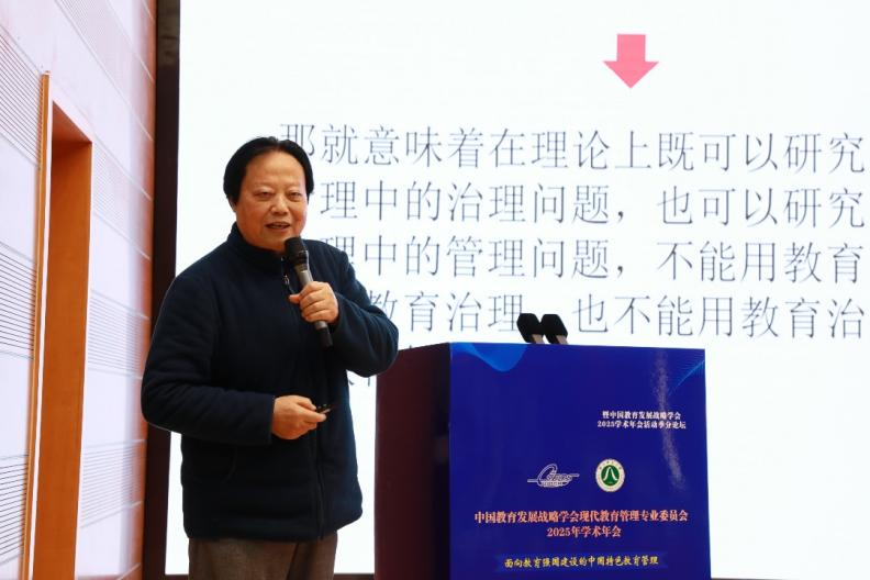 执行院长、教育治理研究中心主任袁晖光教授,赵敏教授(特聘)和何菲博士参加此次会议。在大会主旨报告阶段,孙绵涛作为首位专家作题为《从管理到治理:新时代教育管理学发展面临的新选择》的主旨报告。他从新时代教育管理学为何需要从管理转向治理、面临怎样的转向选择,以及如何实现这一转向三个核心问题出发,结合对古今中外理论观点及“治理”原意的深入剖析,系统阐述了中国教育管理学在创新发展过程中面临的主要问题、成因及其破解路径。他指出,新时代教育管理学实现从教育管理向教育治理的转型,应建立在全面把握“治理”原意的基础之上。他强调,这种教育治理既包含平等协调、多元共治的现代内涵,也涵盖必要的管控与统治的维度,是一种兼具包容性与层次性的理论演进与实践转向。