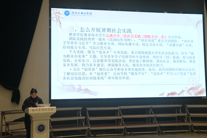 陈翊萱结合暑期社会实践经历,分享了实践项目选择、材料规范与成果转化的经验。她建议同学们在参与实践过程中强化规范意识,注重过程积累,将实践成果积极对接“互联网+”“挑战杯”等创新创业竞赛或新苗人才计划,实现实践与科研、竞赛的协同发展。