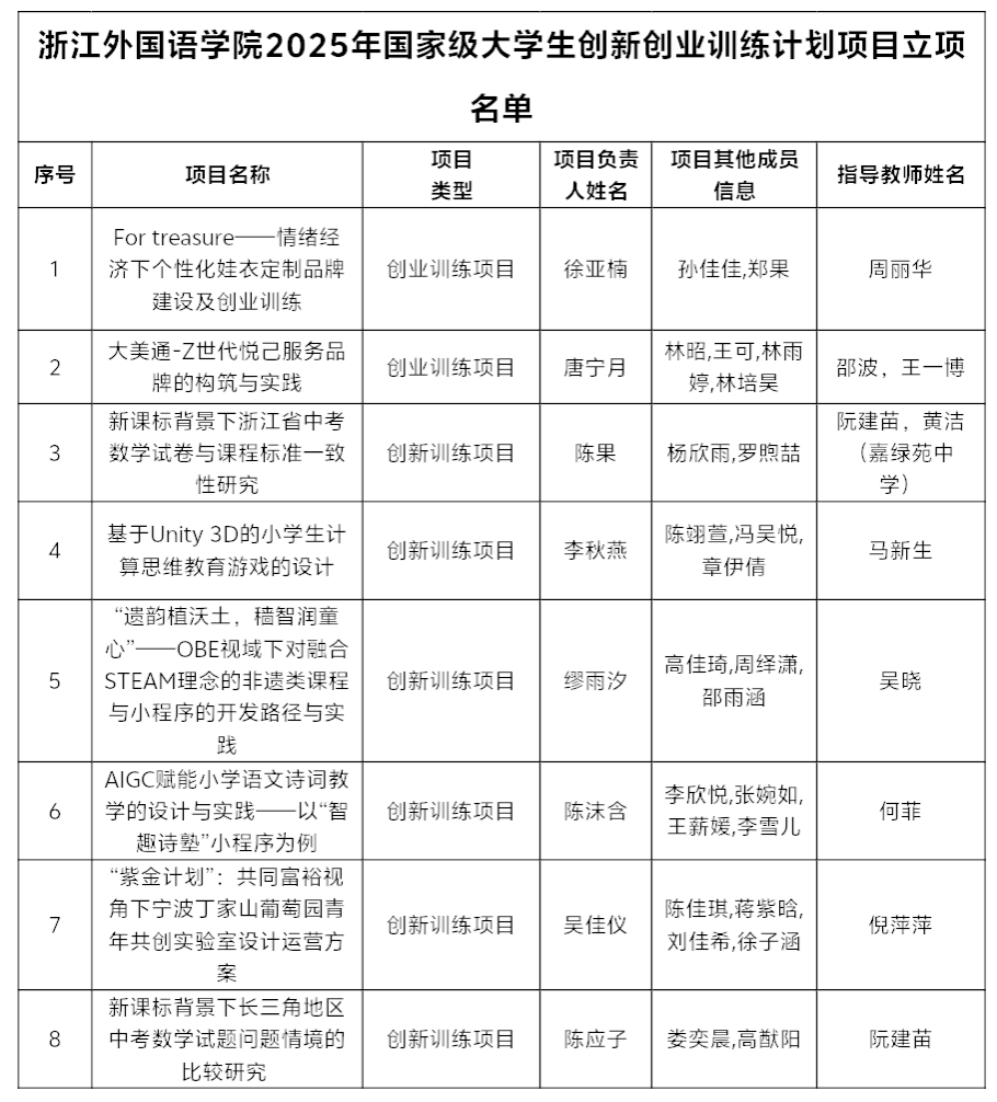 本次获批的8个国家级项目研究领域广泛,紧扣时代脉搏与教育前沿,涵盖了基础教育研究、教育技术应用、课程开发、乡村振兴等多个热点方向。具体包括由阮建苗、黄洁老师指导的《新课标背景下浙江省中考数学试卷与课程标准一致性研究》和《新课标背景下长三角地区中考数学试题问题情境的比较研究》;由何菲老师指导的《AIGC赋能小学语文诗词教学的设计与实践--以“智趣诗塾”小程序为例》;由吴晓老师指导的《“遗韵植沃土,穑智润童心” -OBE视域下对融合STEAM理念的非遗类课程与小程序的开发路径与实践》;由马新生老师指导的《基于Unity 3D的小学生计算思维教育游戏的设计》;由倪萍萍老师指导的《“紫金计划”:共同富裕视角下宁波丁家山葡萄园青年共创实验室设计运营方案》;由周丽华老师指导的《For treasure 情绪经济下个性化娃衣定制品牌建设及创业训练》以及由邵波、王一博老师指导的《大美通-Z世代悦己服务品牌的构筑与实践》。这些项目不仅体现了同学们敏锐的学术洞察力和强烈的社会责任感,也展现了指导教师团队扎实的专业素养和宝贵的实践智慧。
