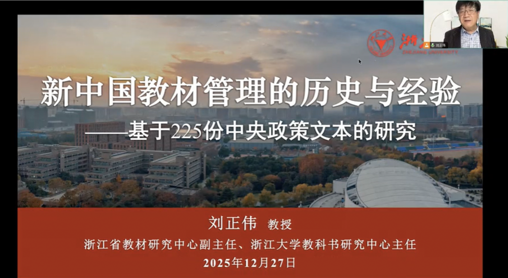 浙江大学教科书研究中心主任、浙江省教材研究中心副主任刘正伟教授以《新中国教材管理的历史与经验》为题,指出未来教材管理需注重政策工具的创新与联动,并兼具教材体系的动态平衡,才能确保教材质量稳步提高,不断推进教育现代化。