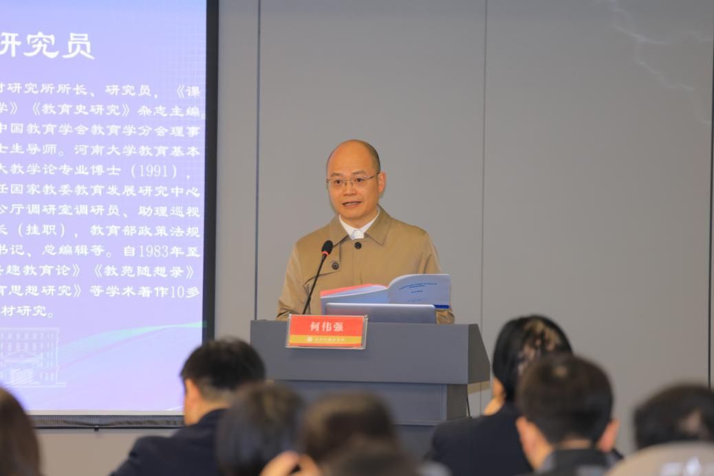 中国教育学会教育学分会会长、人民教育出版社课程教材研究所所长郭戈研究员以《教材建设和管理的十大问题》为题,阐述了教材在教育体系中的核心作用,认为教材建设应紧密结合教育目标,不断加强教材管理的专业化、制度化和标准化,以推动教材质量的整体提升。