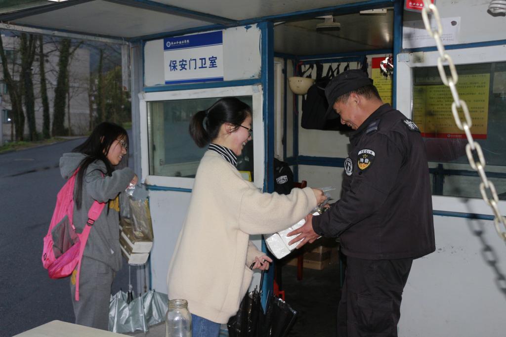 在各个校门口,每天都能看见一群“黑衣人”——保安叔叔,他们身着黑色制服,皮肤因风吹日晒而变得黝黑,看起来严肃而不易靠近,但实际上,他们皆有一颗温暖而柔软的心,不辞劳苦地为学生们保驾护航。当志愿者们送上感恩卡和礼品时,他们双手接过,用浑厚的嗓音说着“谢谢”,不失正派。