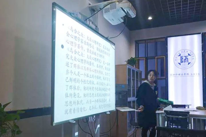 18小语1班的蓝芊慧为我们诠释了群体的定义,她在读完《乌合之众》后,有着属于自己对于群体和个人关系的独到见解,个性鲜明的个体在融入群体后个性都会被这个群体所淹没,他的思想立刻就会被群体的思想所取代。她也指出:我们这个时代,沉默的往往是大多数。
