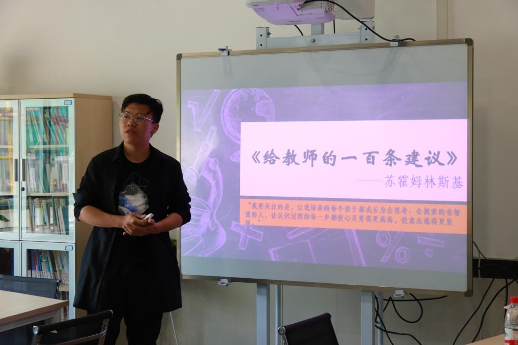 听完同学们的分享,张寿松老师对此进行了点评。他认为,分享诗歌的同学可以加入诗歌朗诵,通过朗诵会更让同学们更加直观而深切地感受这首诗的情感。对于苏霍姆林斯基的书,他认为我们不要全盘接受,要有选择的去看,因为有些书的太过于理论化,并不适合现阶段的学生看。而对于分享论文写作的两位同学,他表示了肯定,同时希望同学们在下次分享中可以更加自信和有趣地为大家介绍作品。
