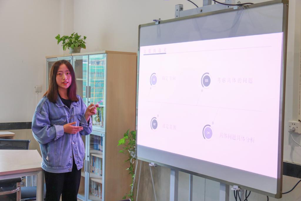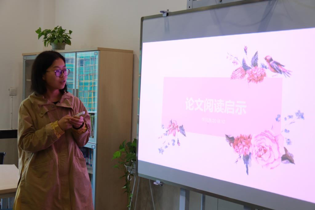 17小数1班的赵璇分享了“论文入手写作交流”。她说,一篇论文首先要确定研究方向,其次是考虑具体的问题,再是选定论文材料的范围,最后是结合具体问题分析。她还向大家分享了如何借助中国知网查找资料及书写参考文献的格式。