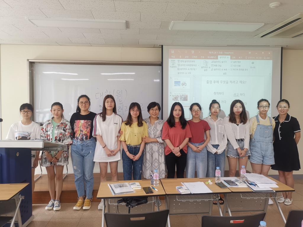 来自诚信女子大学国际教育院的姜教授为实践队员们教授韩国语。课堂上教学内容丰富多彩,姜教授用饱满的教学热情、标准的发音为同学们进行了生动的讲解,队员们也认真听讲,勤于问问题和记笔记。姜教授从讲解韩国语的发音原理到指导朗读课文,从韩服、韩国国旗、国花等基本文化的介绍到韩国饮食、交通等与生活息息相关的文化介绍。在讲解语法时,姜教授更是通过展示韩语助词与汉语、英语助词的使用方法的差异来加深队员们对韩语语法的理解。根据队员们的学习进度,姜教授循序渐进地指导队员们练习对话,这使得实践队员们在短时间内系统地掌握了韩国语基础。