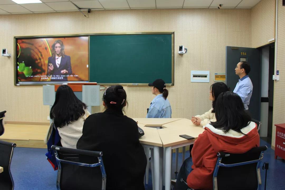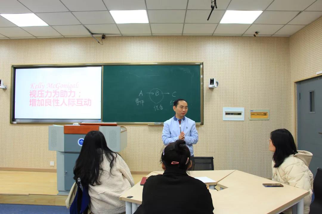 通过让同学回答“你如何看待压力?朋友还是敌人?”这一问题,来了解学生对于压力的看法,并借用《如何跟压力做朋友》TED演讲和“情绪ABC理论”,来告诉同学们在一定条件下,对待压力应当持有积极的信念,不要把压力当作敌人,要把压力当成能够帮助我们成长的朋友、一种对自己的考验与进步的动力。在遇到压力时,可以通过人际互动,来排解自己的压力。最后,他向大家介绍了另一个排解压力的好方法——冥想,调整身体姿势达到放松状态,缓慢自己的呼吸,试着把注意力集中在呼吸上,不加评判觉察脑中出现的事物,以达到舒缓身心的效果。