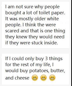 采访显示,其实美国大学生并不是很清楚为什么会有一大群人会抢购厕纸。有的人认为可能是出于过度恐慌而造成的盲目从众消费,从而大量抢购厕纸一类的生活用品。另外,在一些疫情并不是特别严重的地区,有些美国人并没有选择居家自我隔离,仍然会外出遛狗、运动,随时去超市补货。在购物首选方面,绝大数人会选择食物、水、洗护,以及洗衣用品。