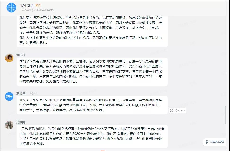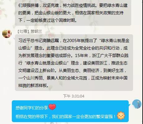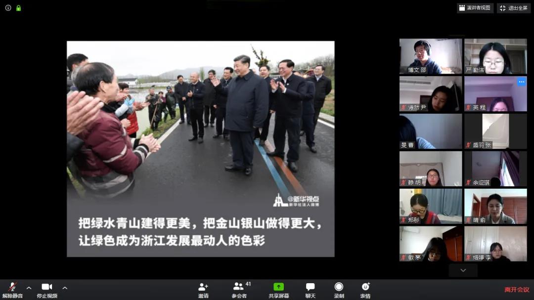 借学习金句、收看视频、阅读新闻报道等方式,支部成员紧跟习近平总书记脚步、坚持“干在实处、走在前列、勇立潮头”的坚定信念,积极从生态保护、干部工作、疫情防控等不同角度对讲话内容进行学习反思,并表达自己对祖国大好未来的衷心祝福。支部成员表示:习近平总书记的浙江之行向社会各界传递出积极信号——在毫不放松疫情防控的前提下,加快推动经济发展早日步入正轨,努力完成今年经济社会发展目标;作为青少年,也将为建设美丽浙江、推进生态文明迈上新台阶注入新鲜力量。