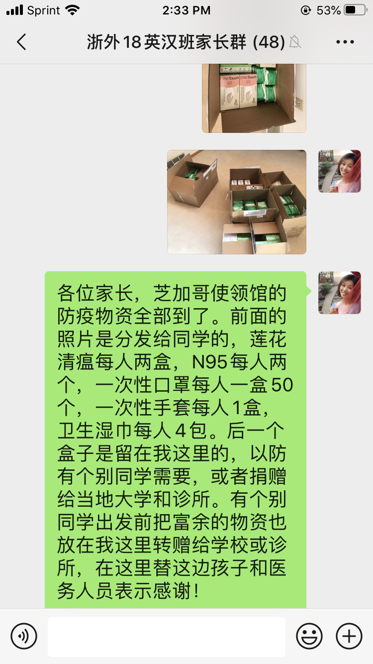 全体教师自发捐款,先后购买了2040只口罩,分两批通过国际快递寄送到留美学子的手上。同学之间也会共享相关信息、相互支援口罩。来自各方的关怀和物资使这些学生能够在做好个人防护的前提下专心学习、安心生活。