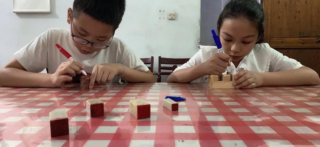 的几位成员也发挥了自己的专业知识技能,现场教授小学生篆刻。面对新奇的事物,孩子们兴趣高涨,过程中虽遇到了难题,但最后都完成了不错的篆刻作品。