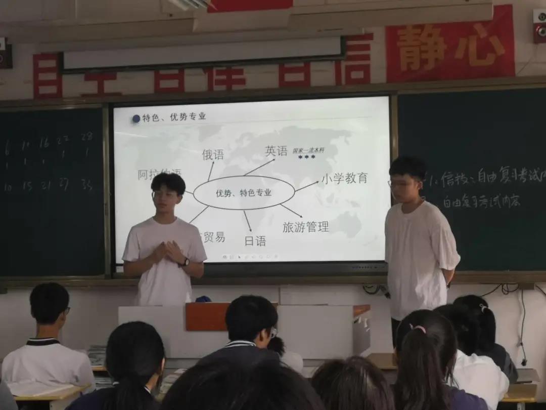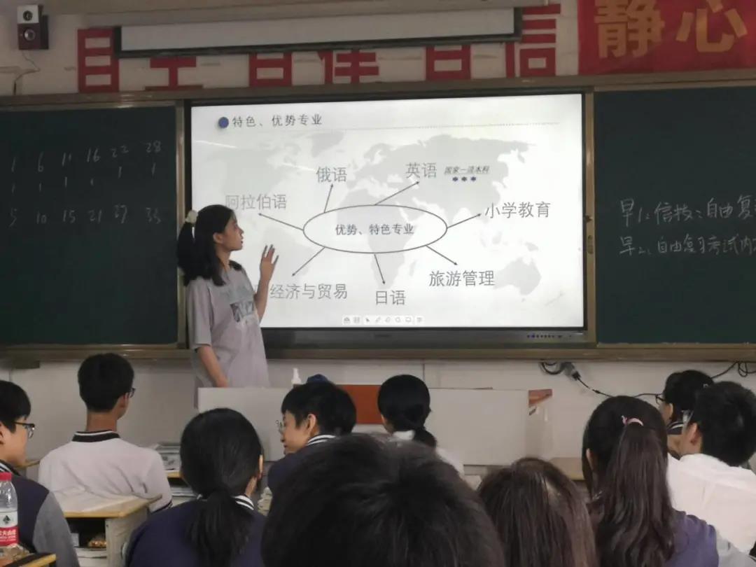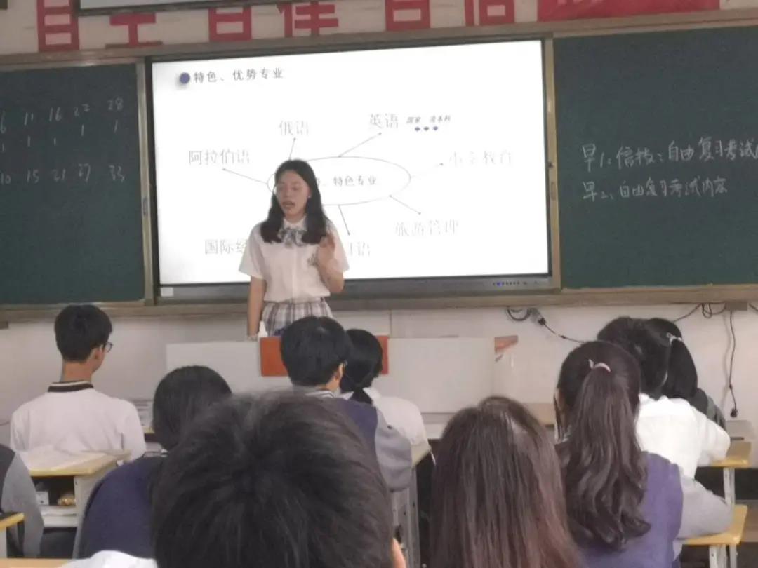 首先,来自不同专业的小队成员们先向同学们介绍了自己和自己的专业,并详细介绍了自己专业的特点、授课方式以及前几年的专业录取情况,为高三的同学们提供了填报志愿时专业选择的参考。宣讲班级中有四位同学高考外语科目是日语,而小分队中就有两位日语系的成员,通过成员们详细的讲解和宣传,学习日语的学弟学妹们对我们学校产生了极大的兴趣。
