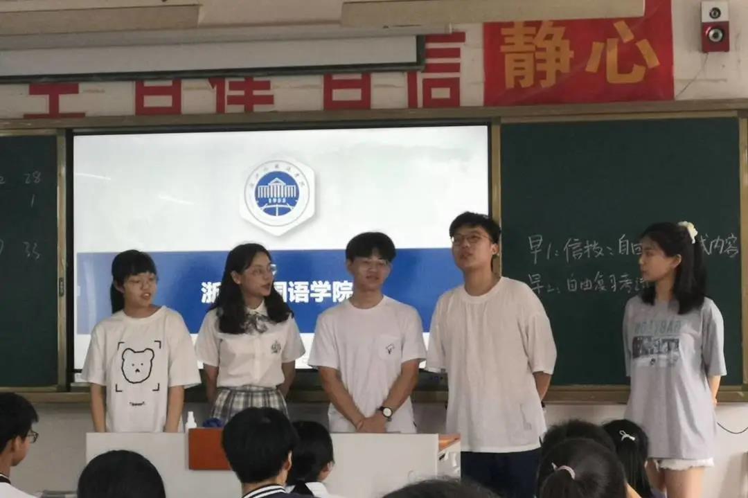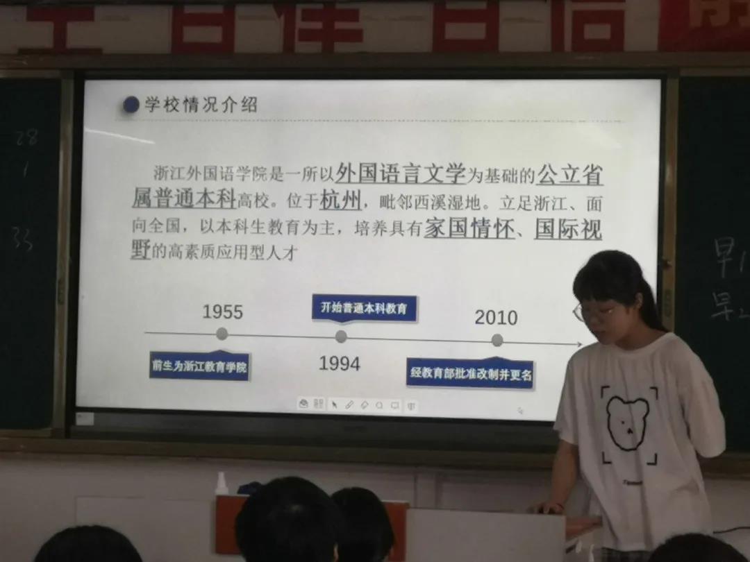值得一提的是,成员骆依凡向高三同学们详细介绍了我校三位一体的招生情况,并跟他们分享了自己当年参加三位一体招生的亲身经历,向高三同学们分享了宝贵的经验。当时正值同学们学考,三位一体招生对学考成绩的要求也激励了他们认真复习。最后,小分队向学弟学妹们表达了自己的祝福和鼓励以及对他们报考浙外的期待和欢迎。