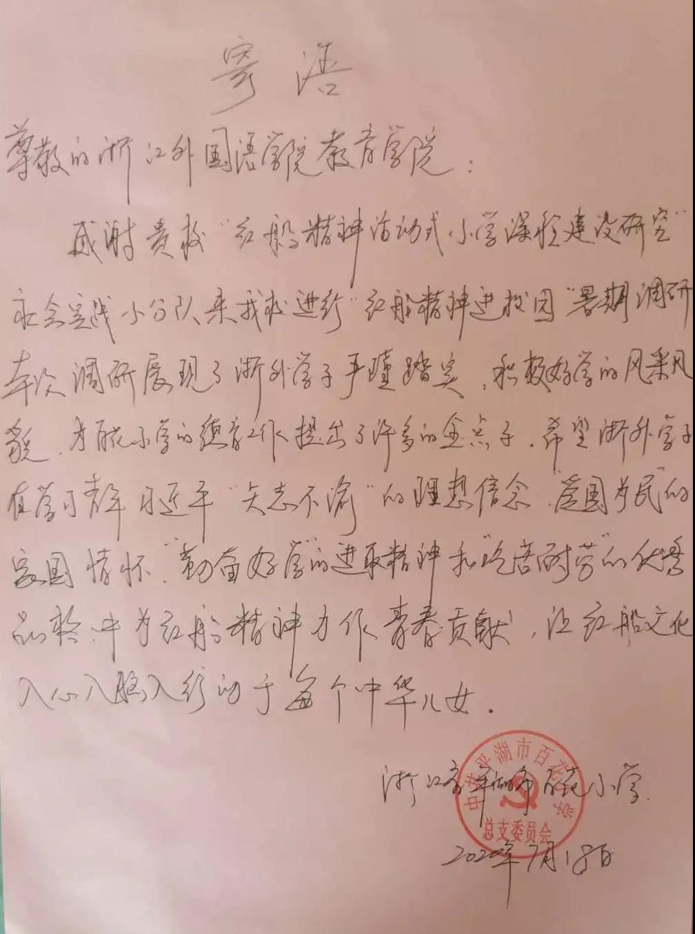 7月18日下午, 调研小分队惊喜地收到了李校长为“红船精神活动式小学课程建设研究”社会实践小分队精心撰写的寄语。成员们由衷地感谢李校长数日来对社会实践成员的精心照料。他们用行动展示着何为“教书”,何为“育人”。小分队将努力为红船精神力作青春贡献,让嘉兴“红船精神进校园”主题教育项目展现给更多教育者,让平湖市百花小学与新疆沙雅第三小学的共建项目被更多人熟知。