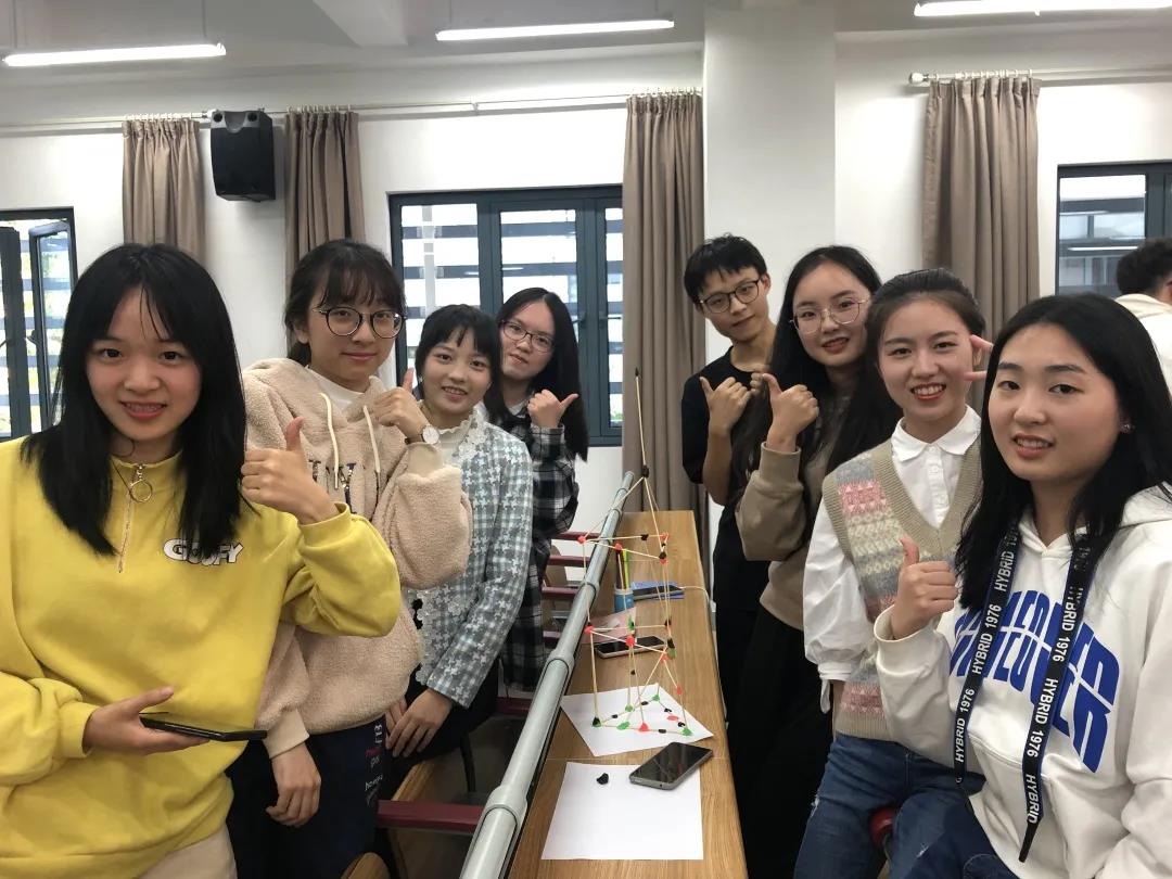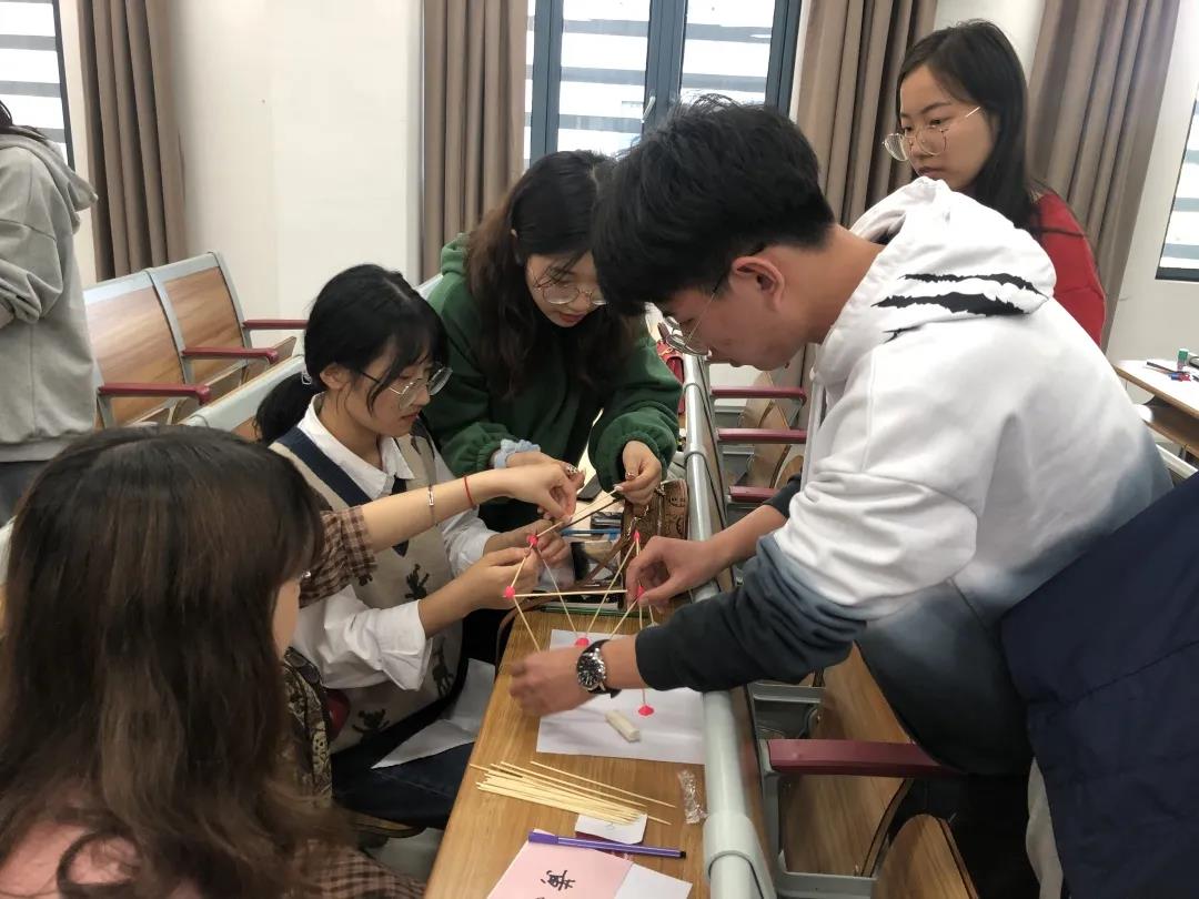 “小组协作”环节。所有成员被分成了七个小组,每个小组运用道具共同完成一个“竹签高楼”作品。大家集思广益,即使搭建的过程坎坷艰难,作品多次坍塌,也始终没有放弃,最终呈现出的作品各有所长,让人惊叹。同时,每个小组在彩纸上写下本组的队名与口号的环节也增强了各个小组的凝聚力。