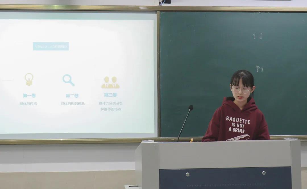 20小教1班的项逸伽与大家分享的是法国心理学家古斯塔夫·庞勒的《乌合之众——大众心理研究》,她以三个问题为引,分别讲述了创作背景、内容概要以及他人和自己的看法。在分享自己看法的同时,项逸伽也表达了自己对这本书合理以及不合理之处的想法。最后,她希望处于当今社会的每一个人都能不断反思、理性思考、保持清醒。