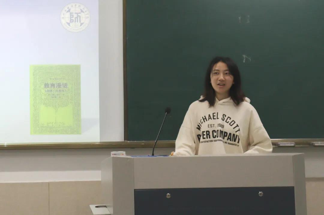 19小教2班的颜榕带来的是英国教育学家约翰·洛克的《教育漫话》,这本书主要论述“绅士教育”。书中并没有说教式的语言,更多的是像促膝长谈一样的温和话语,让人在不知不觉中产生自己的感受。颜榕认为,这本书带给我们的是一种反思与经验运用:教师应该具备哪些素质?这个问题就可以在书中找到答案。