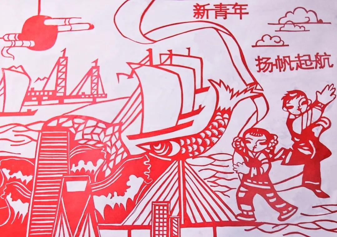 《新青年——扬帆起航》青年一代有理想、有担当,提高自身实力来建设祖国美好家园。作品中融入家乡舟山的海洋元素,希望家乡的繁荣能够助力祖国的昌盛,让中国在青年一辈的努力下被世界所瞩目。