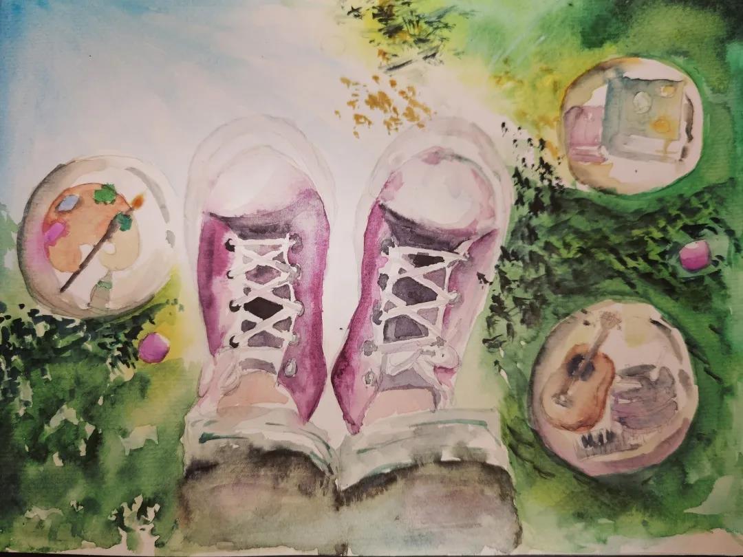 在我眼里的青春,就是勇敢且热烈地向前奔跑,坚定地朝着自己的梦想与目标进发。“帆布鞋”象征着身为大学生的我们,追逐且燃烧自己的青春,以期完成自己的梦想,周围的泡泡里有乐器,绘画用具和书籍等等,表示大学是个多元化且包容性高的地方,正处青春年少的我们,在努力读书的同时,也可以发挥自己的特长,让自己的青春过的有意义。