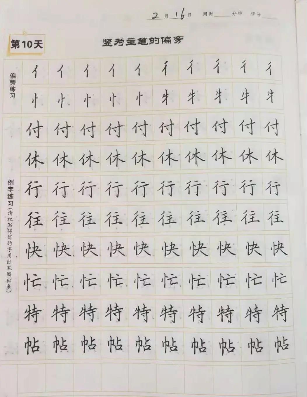 20小教1班的陈陶逸在坚持了21天的打卡后发现了自己新的爱好——书法。虽然年味十足的寒假诱惑多多,好吃的好玩的催人倦怠,她也一度产生过对打卡的退意,但是看到牛牛打卡圈中那么多同学都还在坚持,她不禁暗暗反问自己:“别人可以做到,难道我就不行吗?”一天天过去,练得多了,她惊讶地发现自己在一次次进步中真的爱上了书法。当一件事变为真正的热爱,或许就更容易坚持了。